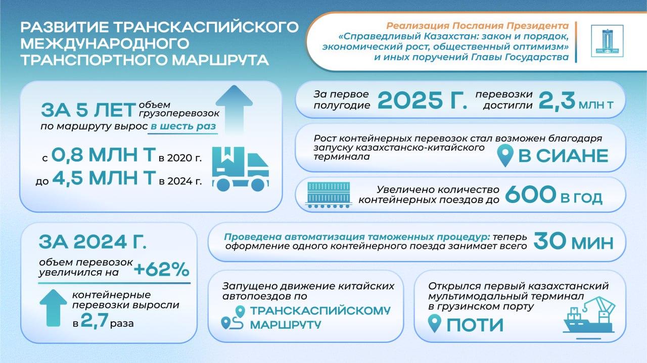 В рамках реализации Послания Президента Касым-Жомарта Токаева «Справедливый Казахстан: закон и порядок, экономический рост, общественный оптимизм» и иных поручений Главы государства, Правительством проводится работа по развитию международных транспортных маршрутов.