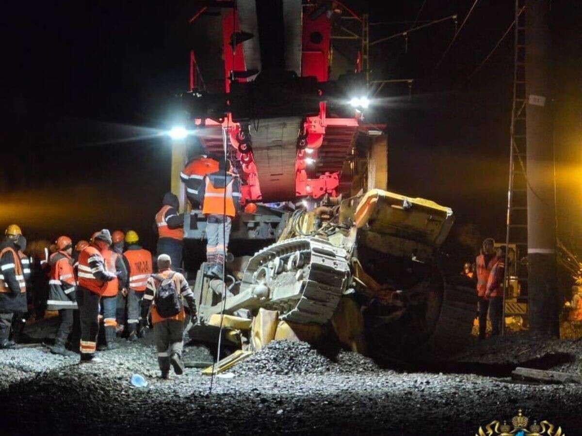 При движении укладочного крана произошел сход подвижного состава, с выездом на участок с демонтированной рельсошпальной решеткой и столкновением с бульдозером.